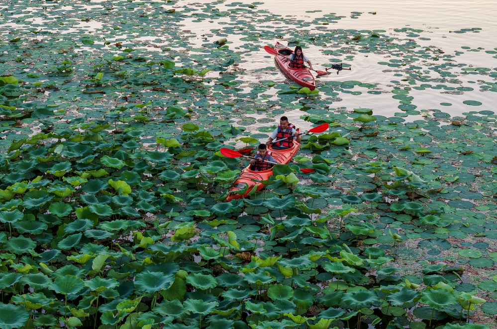 13日下午,位于东西湖区的黄塘湖公园内,市民划着皮划艇、智能游船、桨板深入荷塘深处,穿梭在荷花丛中,在指定区域采摘荷花、莲蓬,体验采莲之趣。运营方介绍,该项目旨在通过沉浸式水上活动让市民近距离感受中国传统荷文化魅力,在都市中寻觅自然野趣。记者史伟 摄