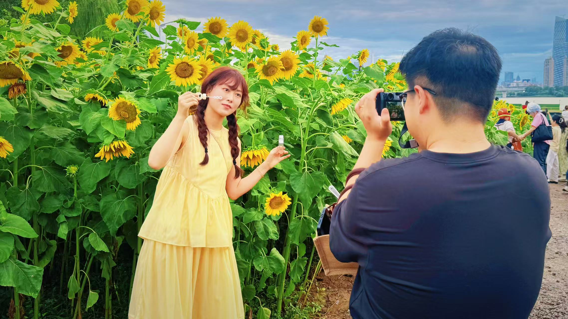 浪漫花海中,贴心地预留了观赏小径。游客们的镜头几乎没有停过,纷纷举起手机,耐心调试位置——要把那棵网红树、怒放的向日葵、古朴的白塔连同辽阔的江景,完美收进同一个画面里。在采访中,不少游客都是外地口音,有来自河南、苏州、陕西、广东等地。光拍景当然不够,还要在此景中留下洋溢着笑容的人像。精心打扮的年轻姑娘们穿着漂亮的衣裙,在专业摄影师的指导下寻找着最佳角度。“不要只拍花。”一位反复调整站位的游客笑着说:“得把树、人、江、塔都拍着才有意思!”