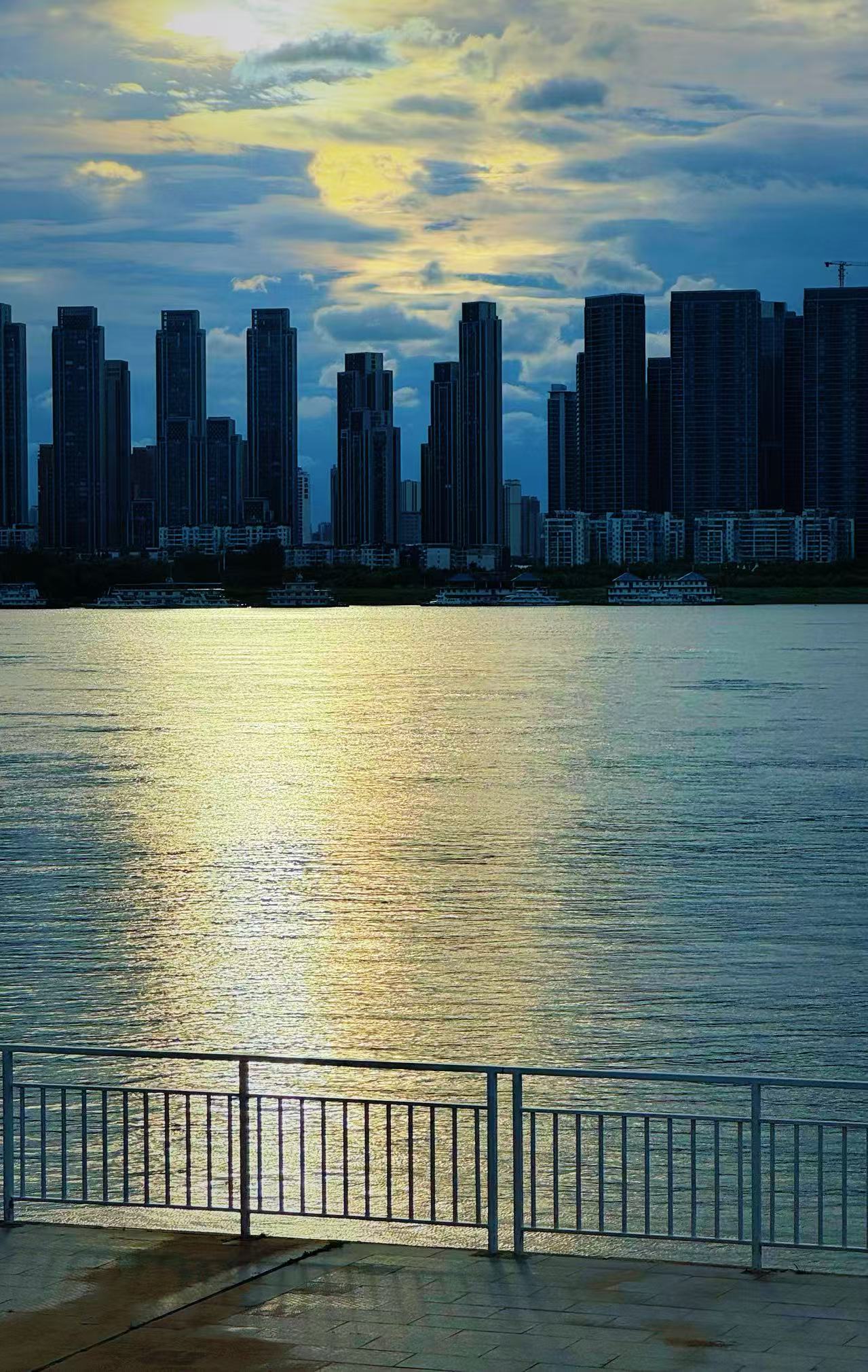 天色渐晚,暮色为江滩披上一件“蓝调”外衣,对岸的高楼大厦被璀璨的灯火点亮,衬得辽阔江面更加壮丽。一边是长江二桥,一边是二七长江大桥,在灯光映衬下更显雄伟。而当入夜时分,游客越来越多。旁边的白塔咖啡屋的屋顶也成为观景平台,站满了欣赏江景和花海的游人。