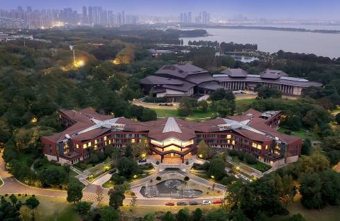 东湖宾馆坐落于风光秀丽的东湖之滨,庭院面积2800亩,水岸线3000多米,东眺磨山,南望珞珈,院内绿树叠翠、曲径通幽,湖光山色、自然天成。