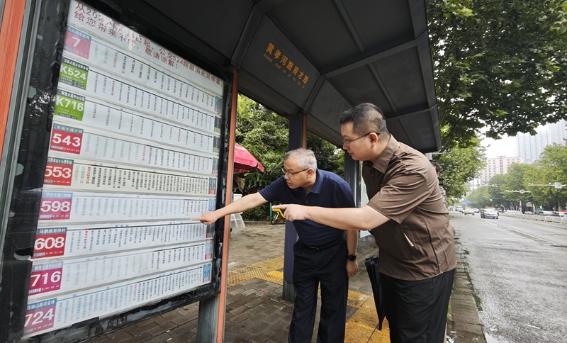 夏日炎炎,黎云、梅赞超来到一处公交站点,仰头望向站亭提示屏上滚动的飞字,又转向站牌轻声商量,还不时在笔记本上提笔记录。“只有沉在一线、融入交通,才能发现问题,提升城市交通便利度。”黎云说道。